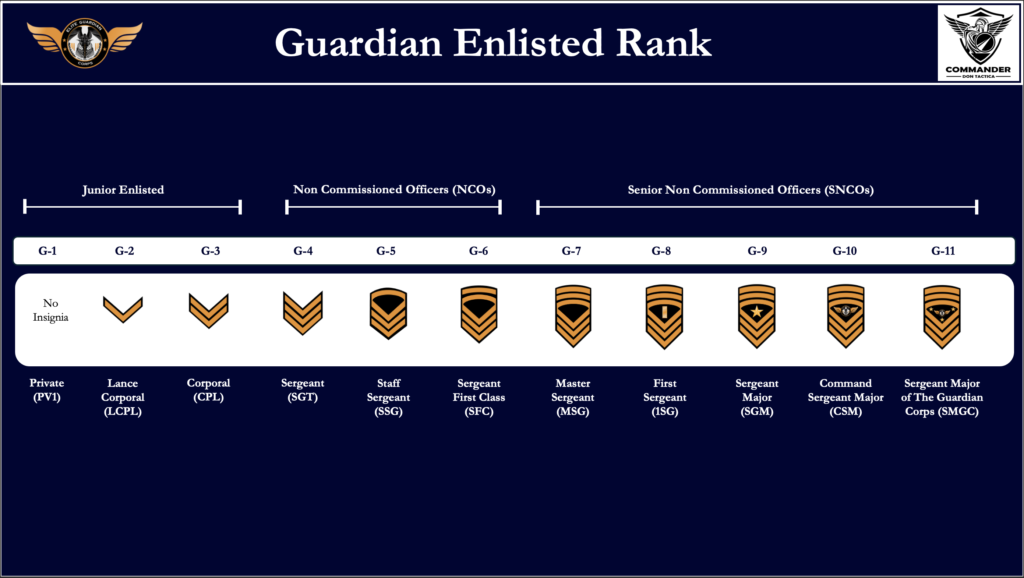 The Guardian Corps is structured into three (3) distinct categories of uniformed services: