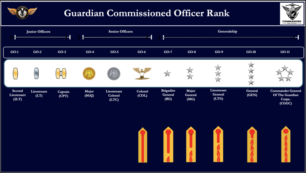 Leaders of The Guardian Corps, Guardian Officers are entrusted with crucial decision-making responsibilities and the safety of The Guardians under their command. Below are the requirements for becoming a commissioned Officer: